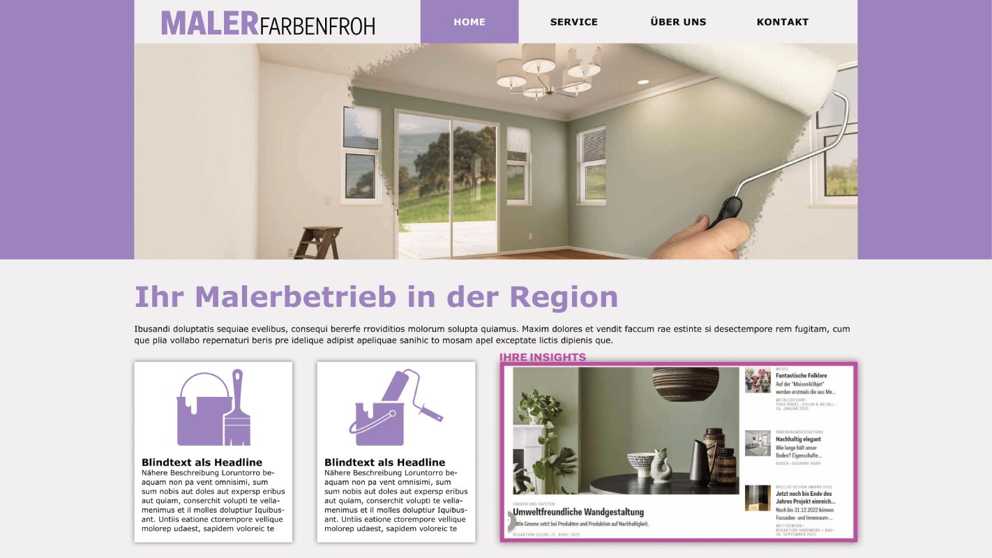 Die color INSIGHTS werden in einem neutralen Design in Ihre Website integriert und versprechen Ihren Kunden ein Lesevergnügen mit Qualität und Relevanz. Investieren Sie in Ihr Expertenimage und begeistern Sie Ihre Kunden mit wertvollen Informationen aus der Welt des Maler-Handwerks.